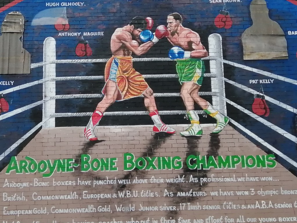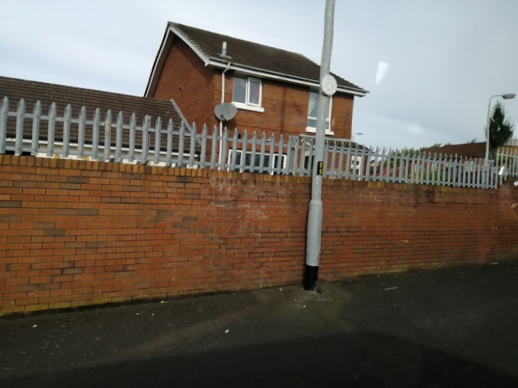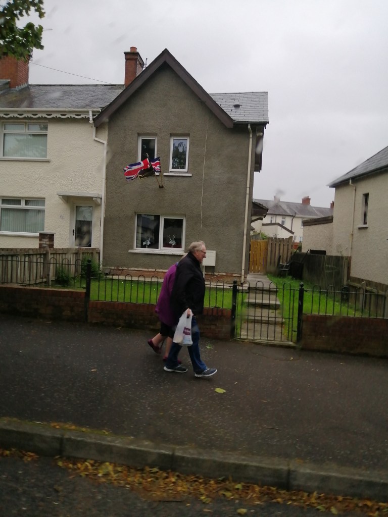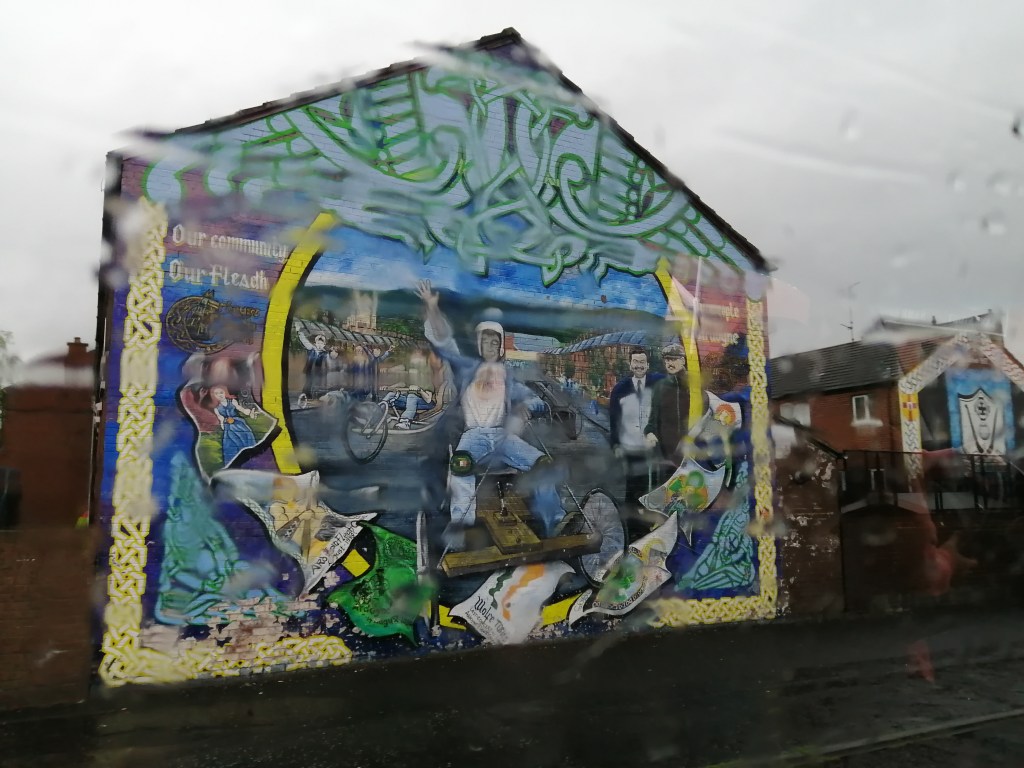 A Celtic window, and a graffiti marked sign, reminding the neighborhood to use the bin; this a community information center that is locked with a high and locked fence around it. One of the many Belfast murals. Walking two “bobbies” in a twin pram; this is the road I now live on, and where the program is.