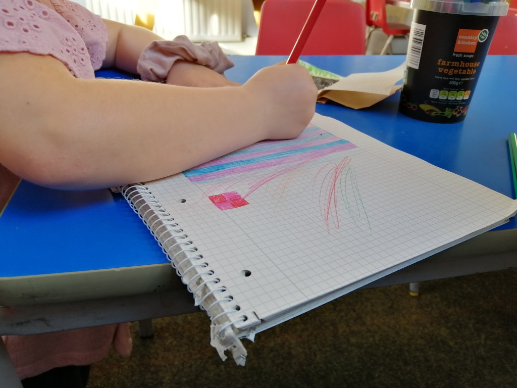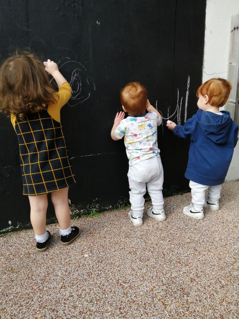 Three siblings using chalk outside. Working on core strength, fine motor grasp, twisting and maintaining balance, in and out! https://dhg.org.uk/links.aspx?nationalRefueling each other. https://williams-syndrome.org.ukThree of us chose to collaborate on some coloring, during after school. This wee person played the piano, sang, and bopped. Portable bubble play. Exploring, with comforting and much-loved blankie nearby.